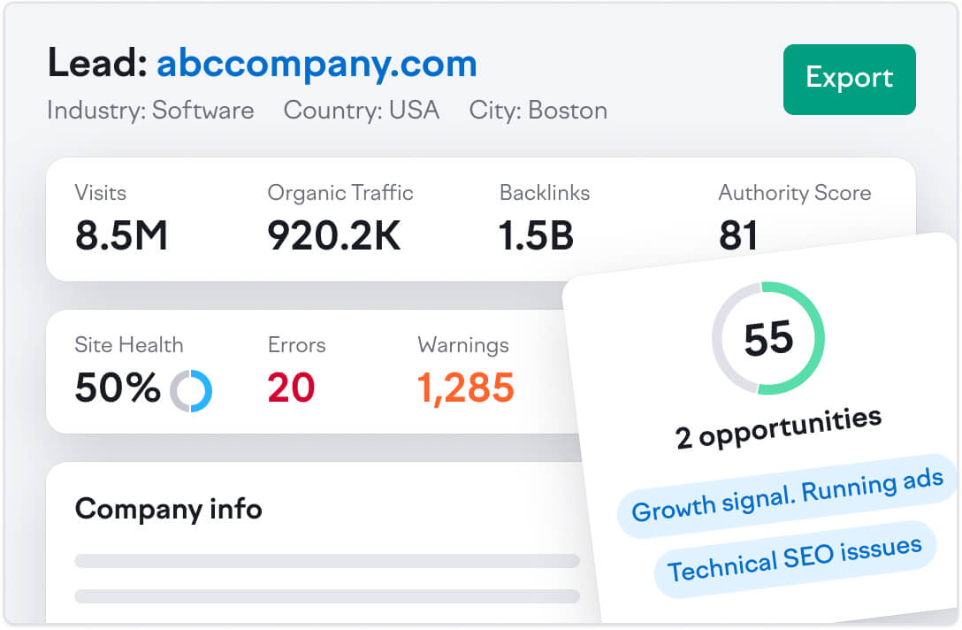 - Measure leads’ potential by looking at their profiles in detail, including their marketing, analytics, and website development tools, as well as website health and traffic insights.