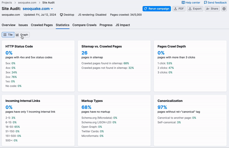 The Statistics tab of Site Audit provides you with additional useful reports about the pages crawled within your Site Audit campaign. The tab contains reports on the following metrics: