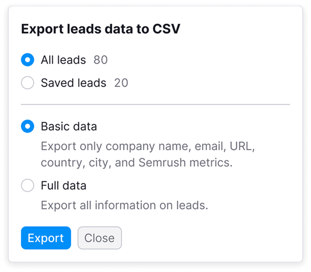 Easily narrow down the list of prospects based on the Semrush Lead Score and the SEO metrics that matter to you.