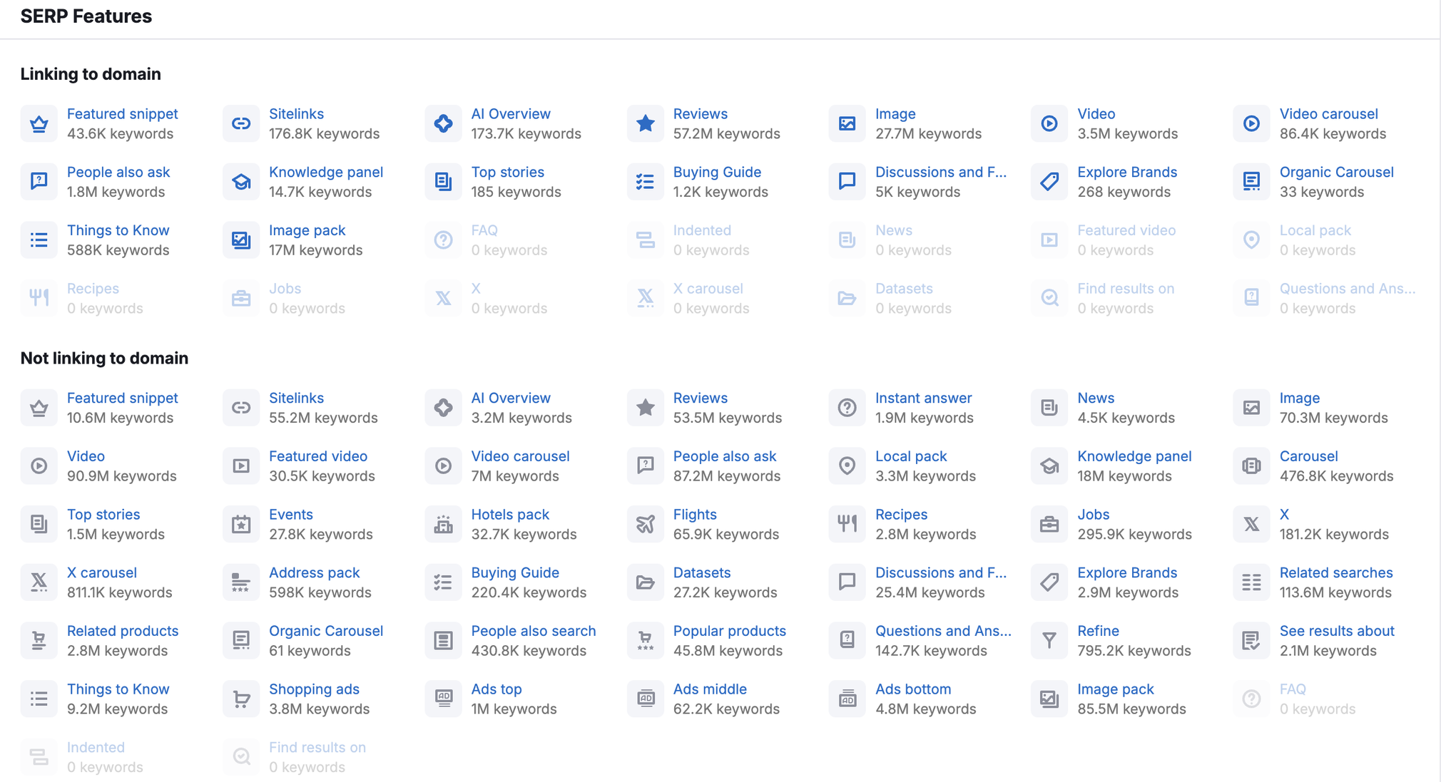 They’re represented only with their unique SERP feature icon in the Positions column. There is no specific position we can attach to these because they are not directly tied to a “traditional” organic listing, like sitelinks or review stars.